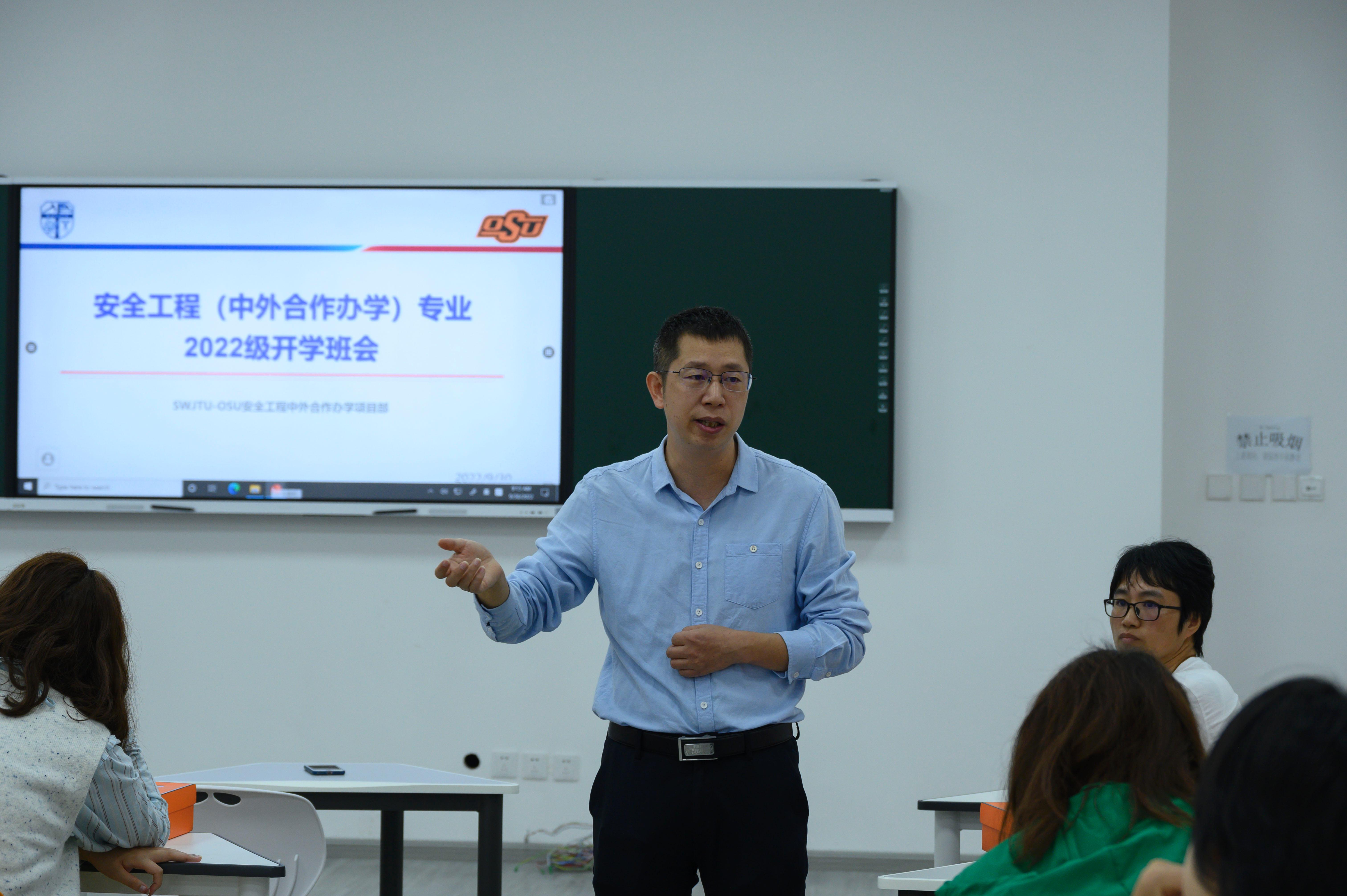办公室主任兼项目部行政主管关方,环境工程专业OSU项目教学主管、学业导师刘洋,综合事务员陈茜,教务员老师牛小会,学业导师代表张胜利、陈钰、曾卓,工程基础化学课程任课老师Hassan,以及2022级安全工程(中外合办)与环境工程(中外合办)专业全体学生。本次教学班会分别由辅导员翟琦老师、孙惠敏老师主持。