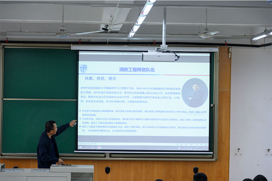 第二个环节由消防工程系老师主要讲述,李涛老师主持。李涛从全球火灾、消防事故等方面引入消防专业介绍,为同学们讲解了学科专业开设历史、全国开设消防工程专业高校、学校消防工程系发展,以及专业管理服务团队。他对拉斯维加斯娱乐城