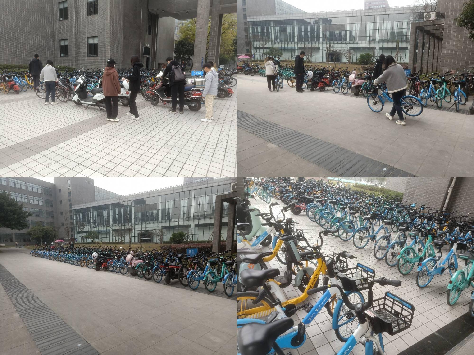 安排工作人员挪移物资带来不便。为此,党员志愿者们在不打扰考场考生的前提下,将共享单车扶至内侧空地整齐摆放,恢复四号教学楼附近道路的整洁和通畅,提升地下停车场清扫的工作效率。