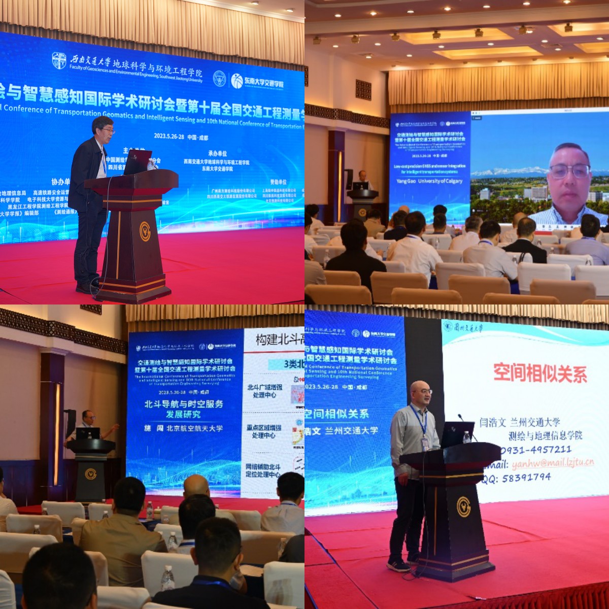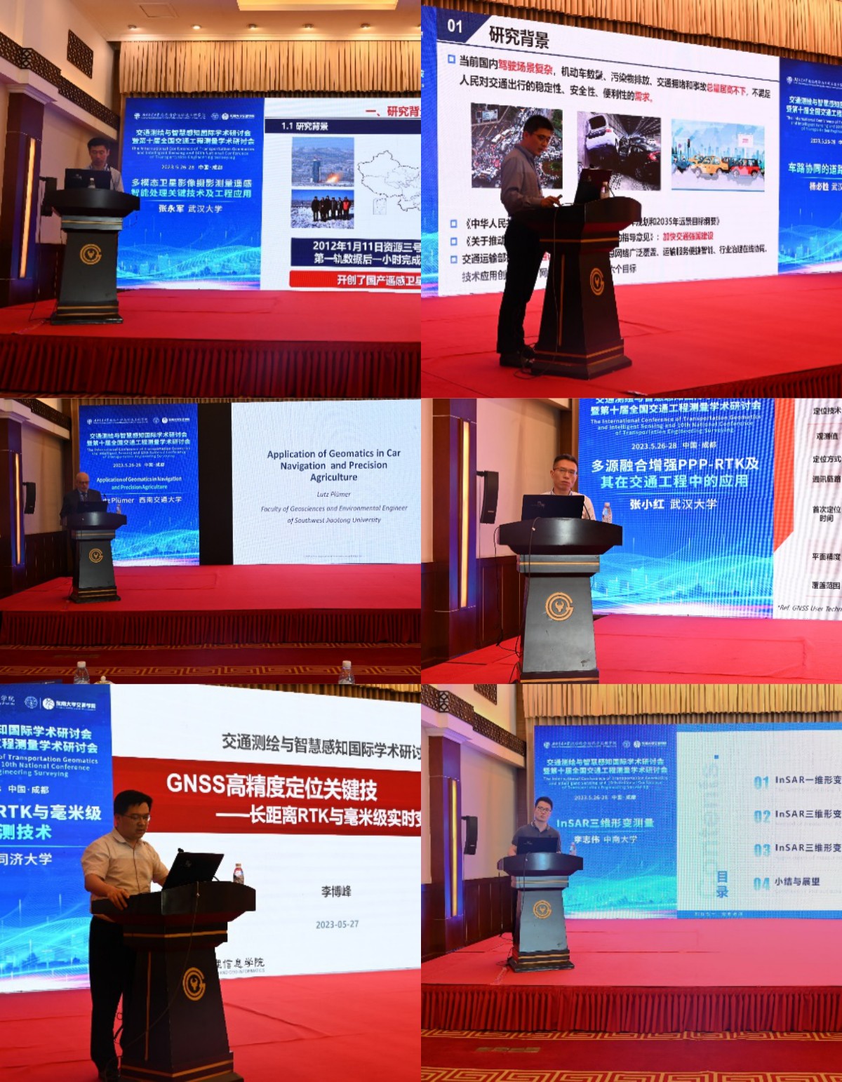 会议特邀报告由东南大学高成发教授、西南交通大学李志林教授共同主持,加拿大卡尔加里大学Yang Gao教授、北京航空航天大学国家级人才施闯教授、兰州交通大学国家级人才闫浩文教授、武汉大学国家级人才张永军教授、武汉大学国家级人才杨必胜教授、西南交通大学Lutz Plümer教授、武汉大学国家级人才张小红教授、同济大学国家级人才李博峰教授、中南大学国家级人才李志伟教授等9位专家做了特邀报告。他们报告的题目分别为“Low-cost precision GNSS and sensor integration for intelligent transportation systems”、“北斗导航与时空服务发展研究”、“空间相似关系”、“多模态卫星影像摄影测量遥感智能处理关键技术及工程应用”、“数字孪生城市交通基础设施”、“Application of geomatics in navigation and precision agriculture”、“多源融合增强PPP-RTK及其在交通工程中的应用”、“GNSS长距离RTK与毫米级实时监测技术”和“InSAR三维形变测量”。