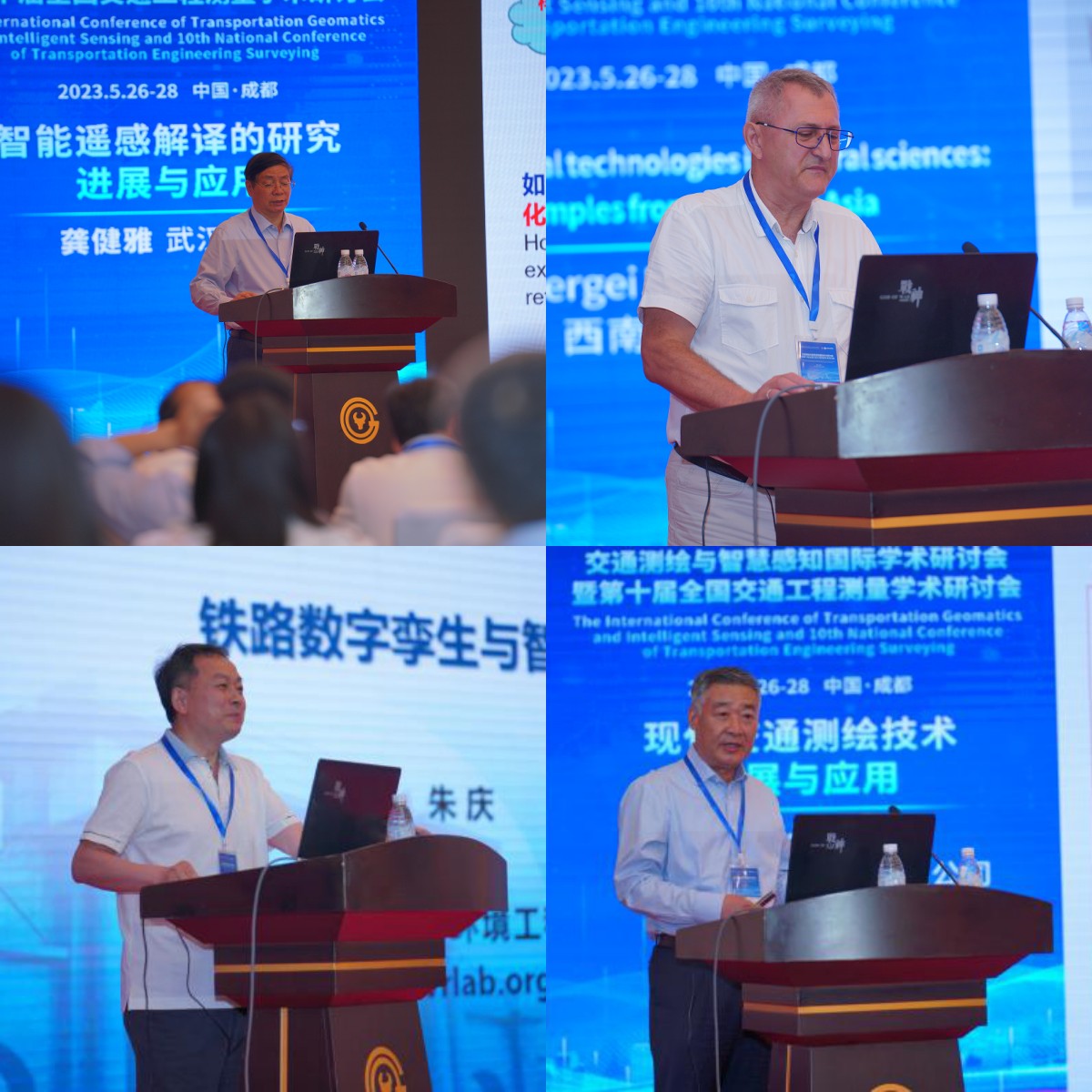 院士/武汉大学宇航研究院院长龚健雅教授、西南交通大学Sergei Krivonogov教授、西南交通大学学术委员会副主任/国家级人才朱庆教授、全国工程勘察设计大师/中国铁路设计集团有限公司王长进副总工程师做大会主旨报告。四位特邀专家先后做了题为“智能遥感解译的研究进展与应用”、“Information technologies in natural sciences: example from Northern Asia”、“铁路数字孪生与智能建造”和“现代交通测绘技术发展与应用”的学术报告。四位专家就新型测绘技术在交通领域的研究进展进行了精彩讲解,赢得了与会学者的热烈掌声。