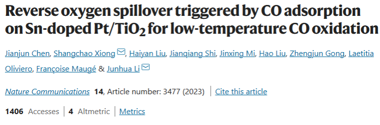 环境污染控制化学团队与清华大学李俊华教授团队合作,在Nature Communications上发表题为“Reverse Oxygen Spillover Triggered by CO Adsorption on Sn-doped Pt/TiO2 for Low-Temperature CO Oxidation”的高水平学术论文。Nature Communications是Nature出版集团旗下的一本综合性自然科学期刊,致力于发表高质量、原创性自然科学研究成果,涵盖了物理、化学、生物学、环境科学、材料科学、地球科学等领域。Nature Communications的2021-2022年影响因子为17.694。论文主要作者有:陈建军(清华大学,第一作者)、熊尚超(西南交通大学,等同一作,共同通讯)、李俊华(清华大学,通讯作者)。