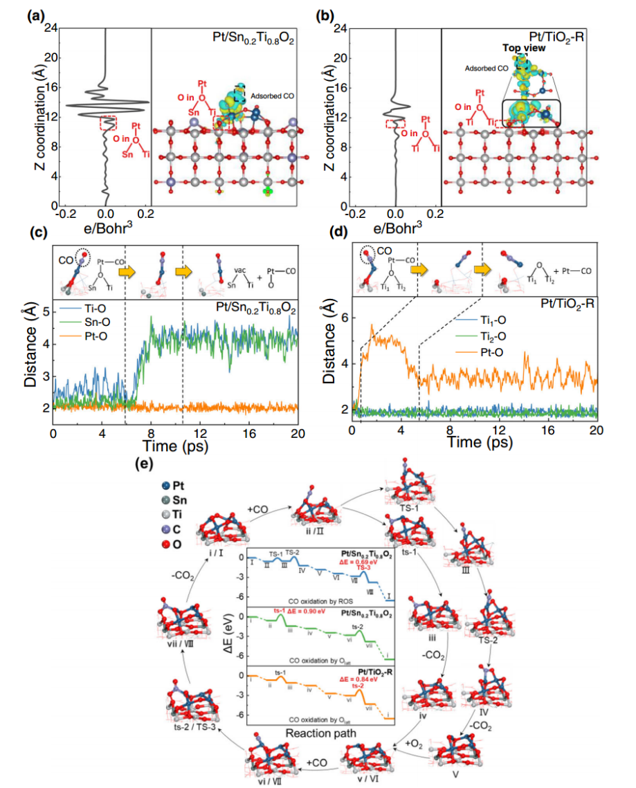 总而言之,将Sn掺杂到载体TiO2后激活了低温(<100°C)下Pt/TiO2催化剂中的氧逆溢流过程,显著提升了Pt/TiO2催化剂的CO氧化活性。结合NAP-XPS、原位拉曼/红外光谱和从头算分子动力学模拟,揭示了氧逆溢流过程是指CO在Pt2+位点的吸附引发Sn-O-Ti键断裂,随后O迁移至活性位点导致Pt4+的生成。本研究清晰地描述了由CO吸附引发的氧逆溢流界面化学过程,理解这一过程有助于设计适用于各类催化反应的催化剂体系。