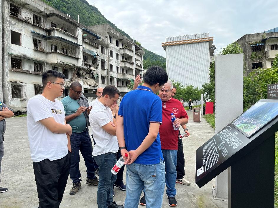 2023年6月7日,丁明涛教授团队带领外方参观了北川地震遗址,向外方团队讲解了“5.12地震”的详细情况,包括地震的灾损、地震对岷江上游地区的影响、地震次生灾害以及当地聚落的重建和迁徙情况等。巴西的教授Diago和古巴的教授Ricardo也交流了巴西和古巴的地震对当地造成的影响,双方探讨了中外关于救灾策略、地震次生灾害、灾后重建等方面的异同,互相学习对方的优秀经验。