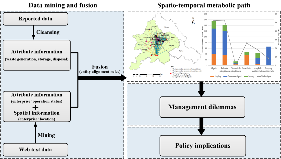 危废引发环境风险的节点可能存在于其代谢链中的各个环节,比如产生、贮存、运输以及末端处置等。因此,强化危废全过程追溯,提升环境风险应对能力,是废物精细化管理的重点工作。然而,现有的管理模式主要依赖于被动上报数据,尚不足以支撑危废的精细化管理。因数据统计口径不一、粒度不足、时效性弱等问题,难以覆盖废物代谢的全生命周期,留下管控盲区。本研究旨在通过引入大数据技术,耦合管理数据和网络数据,构建城市危废时空化代谢路径,识别危废管控中的卡点和堵点问题,为统筹优化危废处理处置能力,提升城市危废精细化管理水平提供决策依据。