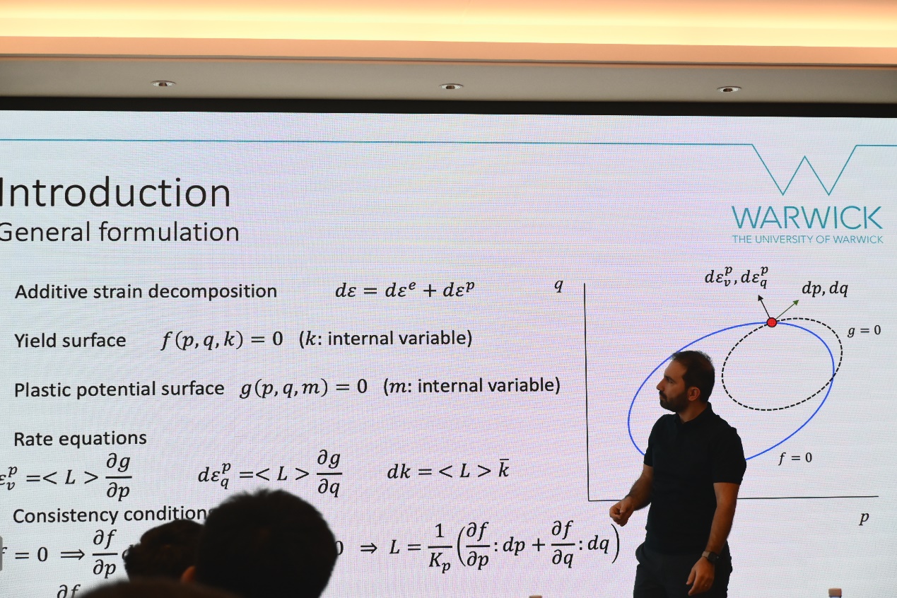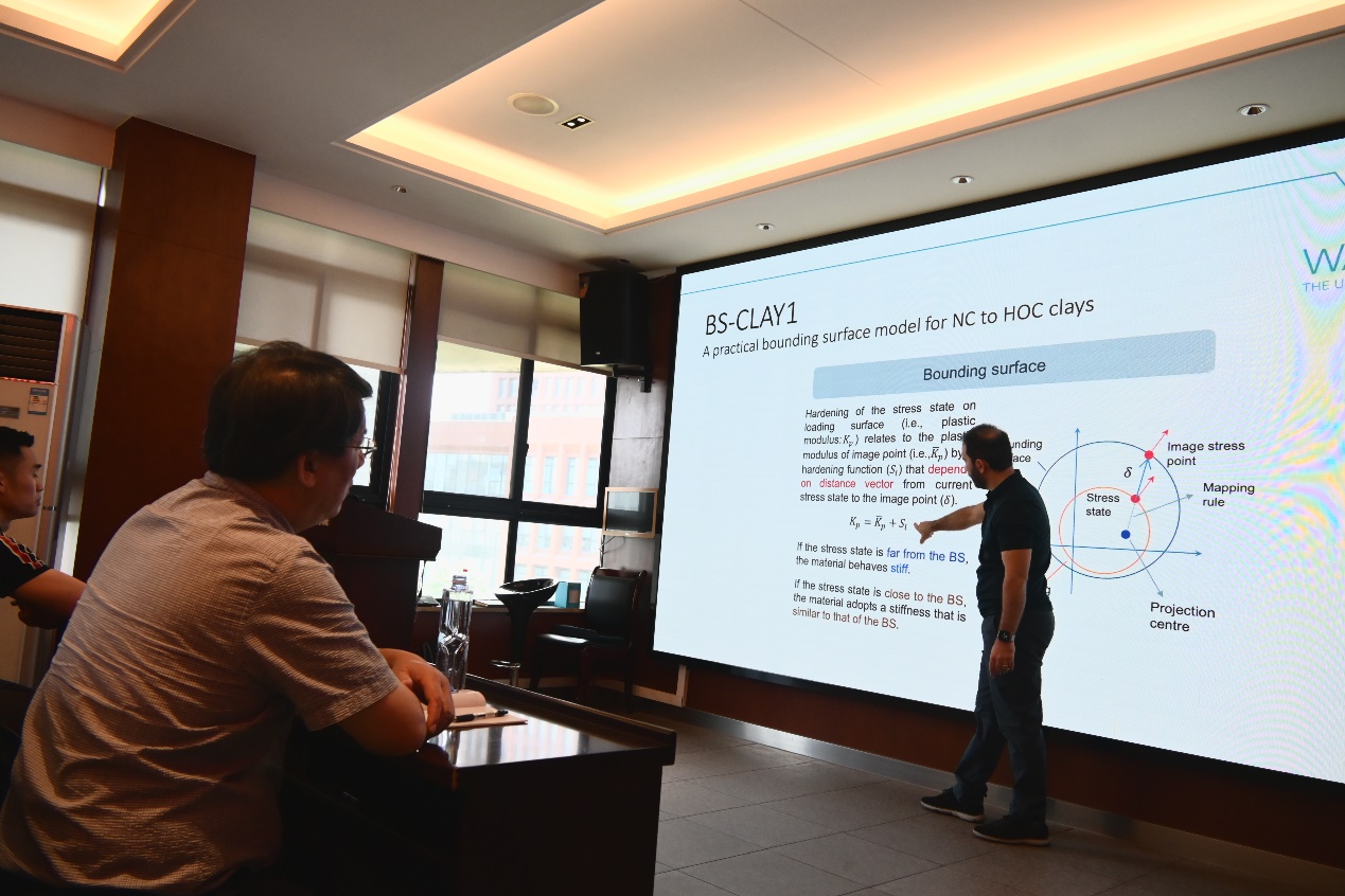 讲座伊始,Mohammad教授以问题为导向,通过岩土工程领域处理不同地质材料力学行为所面临的最具挑战性实际问题,引出了黏土材料临界状态土力学理论发展历程,结合自身研究方向,讲解了土工材料的本构模型开发、数值模拟和试验验证,并重点对其团队所建立的基于临界状态土力学框架黏土自适应各向异性本构模型(AA1-CLAY模型),以及天然黏土和重构黏土在单调荷载和循环荷载作用下,各向异性非关联本构模型的建模过程及模型适用性进行了介绍。