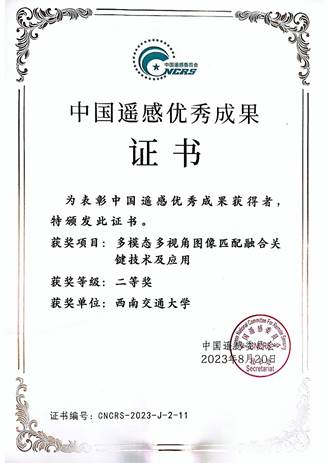 2023年8月20日-2023年8月22日,第二十二届中国遥感大会在常州举行,共有2000多遥感领域学者和产业界人士参加了该次大会,大会上表彰了中国遥感优秀成果,其中,由西南交通大学地球科学与环境工程叶沅鑫老师课题组主持的“多模态多视角图像匹配关键技术及应用”成果获得了2022年度中国遥感优秀成果二等奖,中国遥感委员会在大会上颁发了获奖荣誉证书。
