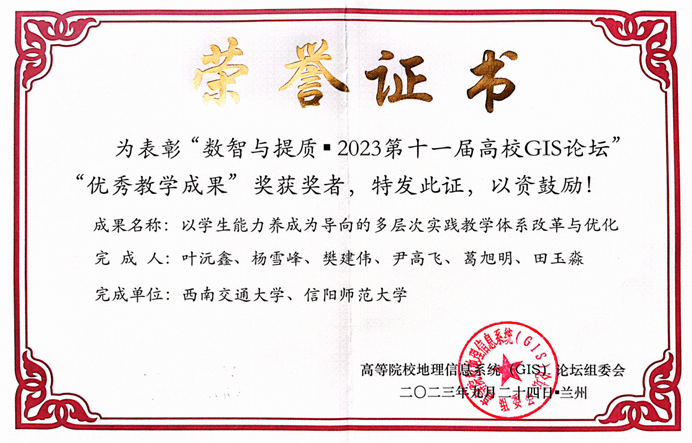 青年教师团队的教学成果“以学生能力养成为导向的多层次实践教学体系改革与优化”项目获得全国高校GIS优秀教学成果奖。该项目由朱庆教授指导,叶沅鑫,杨雪峰,樊建伟,尹高飞,葛旭明,田玉淼为项目参与人员,建立了以培养学生能力为导向的多层次实践教学体系,提出了以科研项目为驱动的产学研人才培养新模式,推动了高校与科研院所、企事业单位共建实践教学平台,形成了创新实践的人才培养体系,培养了一大批优秀学生。