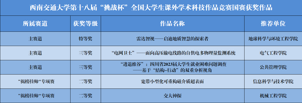 至此,西南交通大学在本次“挑战杯”全国大学生课外学术科技作品竞赛中实现了获奖等级和获奖数量的“双突破”。