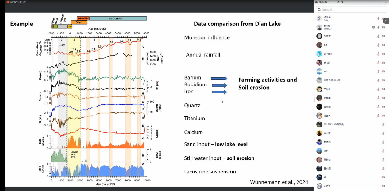 的实验室组织情况及各实验室的分工,并强调固定的实验室管理人员和硕博研究生共同参与实验室管理的必要性。随后,分别就实验室管理人员的职责、实验室基本规则进行了详细说明,如实验室管理者应当定期为学生组织实验课程、负责仪器的维护保养、实验日程安排等。Bernd Wuennemann教授特别强调开设常态化实验课程的重要性,并根据我院的学科背景和专业特色,提出了实验课程安排的具体建议。最后,他以自身科研工作为例,分享了粒度分析实验的注意事项、实验数据的处理方法,以及粒度分析在不同沉积环境中的应用,从理论到实践生动地展示了一次完整粒度实验的具体步骤。