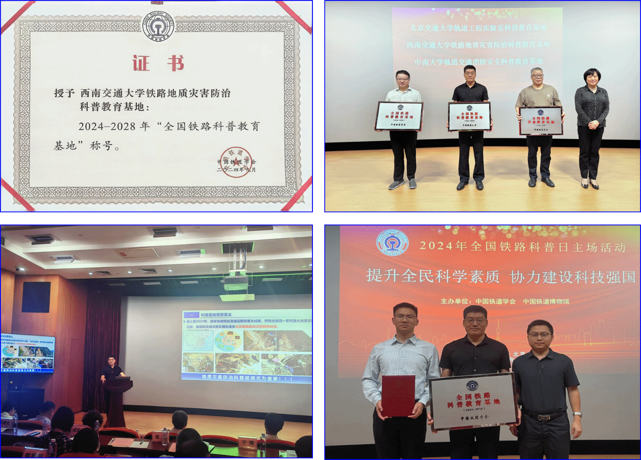 为贯彻落实《全民科学素质行动规划纲要(2021-2035)》,9月19日,中国铁道学会在中国铁道博物馆举行全国铁路科普日主场活动,中国铁道学会理事长、中国工程院工程管理学部主任卢春房院士,中国铁道学会副理事长兼秘书长曾鸣凯,国家铁路局科法司副司长刘燕等出席活动。西南交通大学铁路地质灾害防治科普教育基地入选2024—2028年“全国铁路科普教育基地”,学校赵晓彦教授作为唯一一家高校科普教育基地代表分享了科普经验。