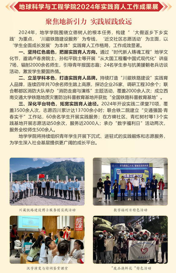 为树立典型、表彰先进,11月23日,西南交通大学2024年度共青团实践育人总结表彰大会暨“青年实干家计划”启动仪式在犀浦校区举行。拉斯维加斯娱乐城(亚洲)官方网站 在2024年砥砺前行,不断深化实践育人工作,多项工作与个人在本次大会上受到表彰。