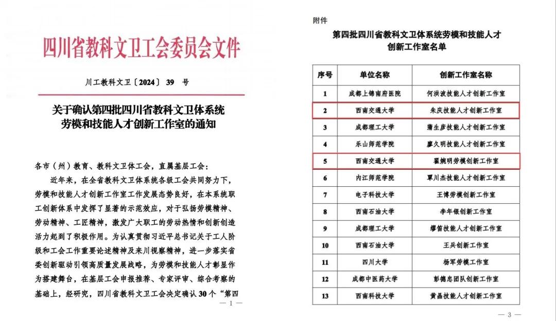 12月10日,四川省教科文卫工会下发《关于确认第四批四川省教科文卫体系统劳模和技能人才创新工作室的通知》,在基层工会申报推荐、专家评审、综合考察的基础上,决定确认30个“第四批四川省教科文卫体系统劳模和技能人才创新工作室”,西南交通大学2家创新工作室榜上有名,分别是翟婉明劳模创新工作室、朱庆技能人才创新工作室。至此,学校已拥有省级创新工作室12个,国家级创新工作室2个。