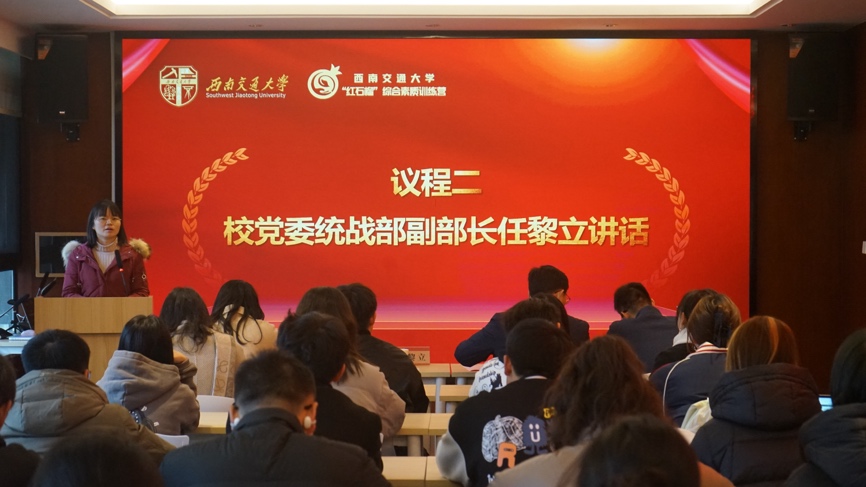 随后,校党委统战部副部长任黎立从“红石榴”综合素质训练营的培训过程为出发点,鼓励同学们以本次活动为契机,深入提升个人能力,铸牢团结意识,在今后的大学生活中取得更多的成绩。任黎立强调,同学们要把在本次训练营中学到的东西融会贯通,向红石榴综合素质训练营的同学们提出了明确的要求、寄予了殷切的期望。同时,对顺利完成结业的同学们表示热烈的祝贺。
