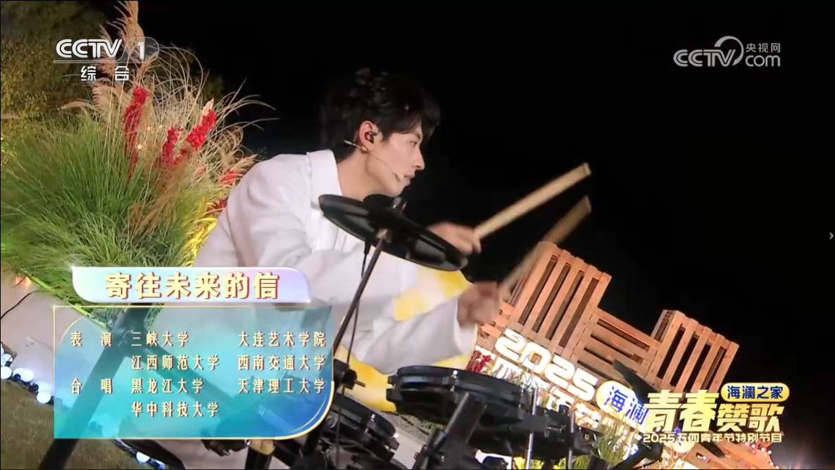 本次特别节目首次突破传统舞台形式,将录制现场搬至深圳海湾与沙滩,以天地为幕、科技为媒,打造了一场青春与时代共振的视听盛宴。从四川到深圳,从课堂到舞台,面对高强度、快节奏的挑战,交大学子迎难而上,白天在烈日与海风中反复打磨动作,深夜在酒店连廊、休息区争分夺秒复习课业;暴雨中湿透衣衫仍坚持排练、沙砾磨破双脚亦未言放弃。青年学子们以“能唱能跳、能文能武”的综合素养顺利参演晚会中《迎风起跑》《寄往未来的信》等四个节目,不仅点亮了荧屏,更以“青春须早为”的锐气、“敢为天下先”的胆识,充分展现了新时代交大青年与祖国同频、与时代共振的精神风貌。