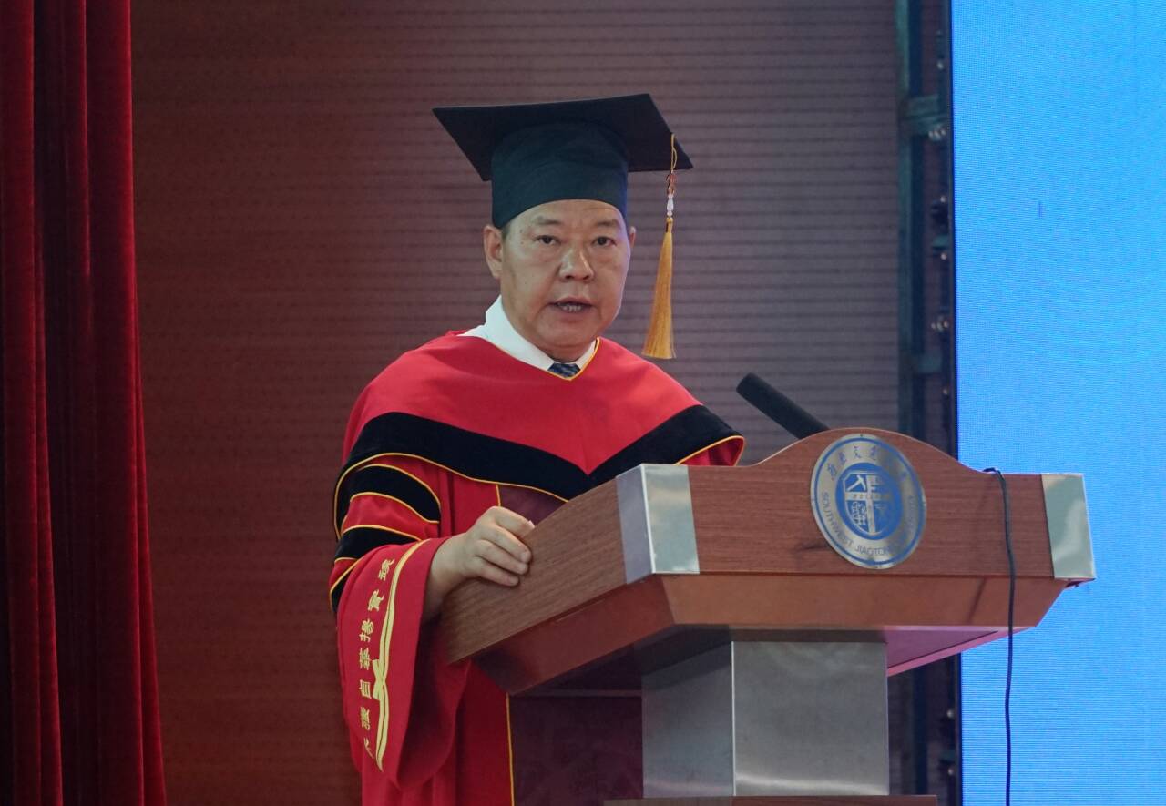 院长刘国祥致辞。他向顺利完成学业、开启人生新征程的同学们表示热烈祝贺,向悉心指导同学们的老师们表示衷心感谢,向在身后默默付出的家长朋友们表示诚挚敬意。他围绕“时代之问”“时代之责”“时代之行”,向全体毕业生提出三点殷切期望,希望同学们胸怀家国,以格局与情怀回应时代之问,在服务国家与奉献社会中书写属于新时代地学人的时代答卷;深耕专业,以笃行与热忱担起时代之责,不畏惧、不迷茫,以敏锐的洞察力和果敢的行动力积极应对,将所学知识转化为解决实际问题的能力;锤炼身心,以坚韧与担当践行时代之行,以豁达的胸襟,在学习工作中,经风雨、见世面、壮筋骨、长才干。他祝福同学们在人生征途上,步履坚定,逐梦无悔,以奋斗的姿态书写无愧于时代、无愧于青春的精彩答卷,为以中国式现代化推进中华民族伟大复兴做出积极的贡献!