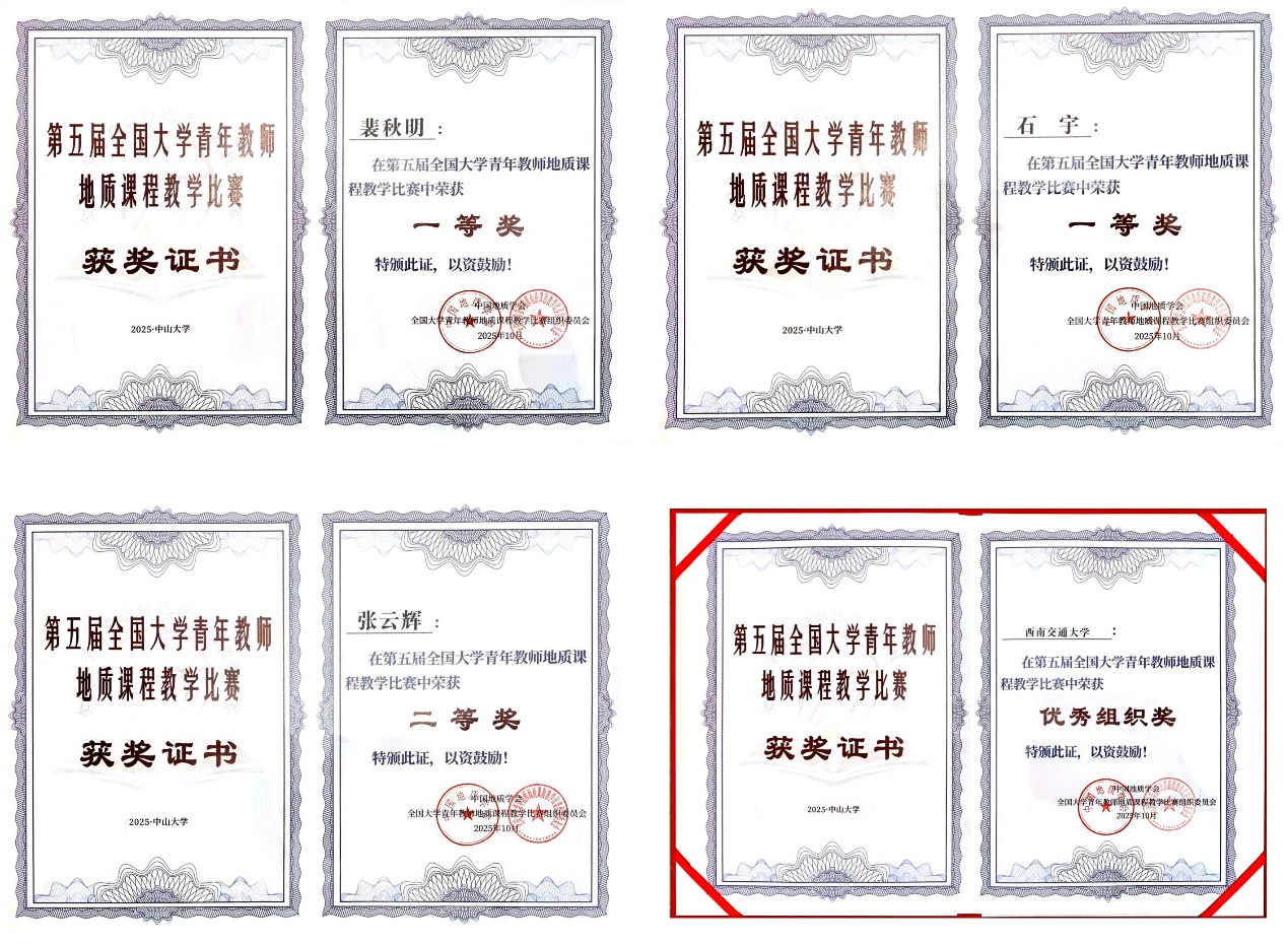 2025年10月25至26日,第五届全国大学青年教师地质课程教学比赛在中山大学珠海校区成功举办。来自南京大学、中山大学、中南大学、中国地质大学、中国矿业大学、西南交通大学等全国68所高校的160名青年教师齐聚决赛。经过两天的激烈角逐,我院地质工程系三位青年教师凭借扎实的专业功底和创新的教学理念,脱颖而出。裴秋明、石宇两位老师荣获一等奖,张云辉老师荣获二等奖。