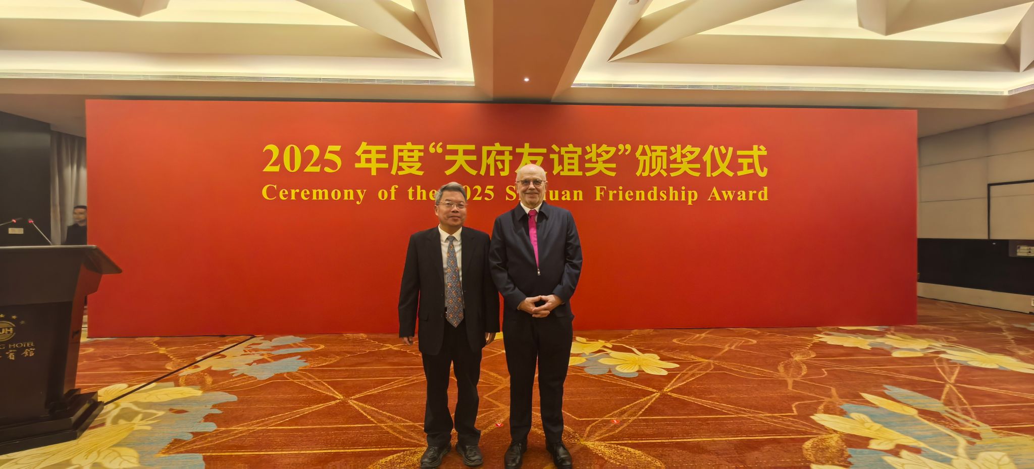 12月2日,2025年度四川省“天府友谊奖”颁奖仪式在蓉举行。四川省委副书记、省长施小琳出席仪式并为获奖者颁奖,表彰其对四川省科技创新、经济建设与社会发展和促进四川对外交流与友好合作所作出的贡献。我院德国籍专家Lutz Plümer教授荣获此项殊荣。西南交通大学副校长周仲荣作为嘉宾出席颁奖仪式。
