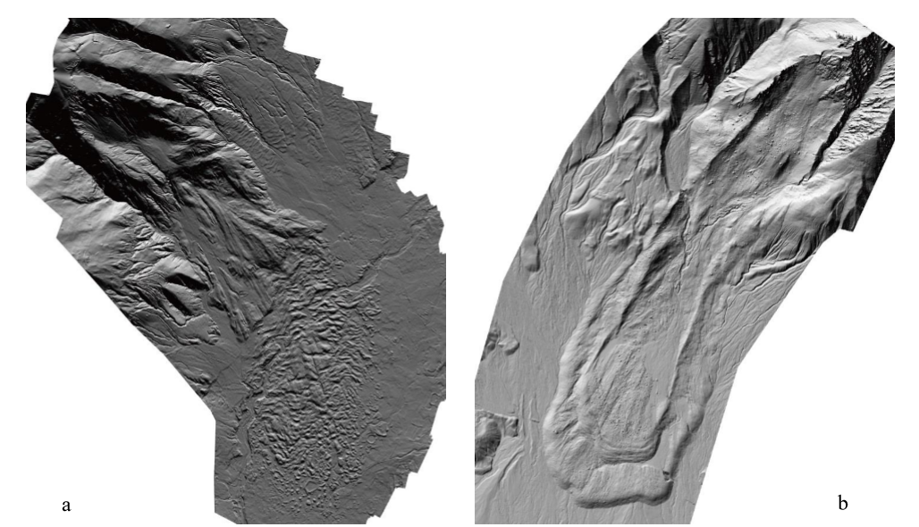 图1 基于无人机遥感影像的尼续村高速远程滑坡(a)和塔合曼高速远程滑坡(b)灰度图