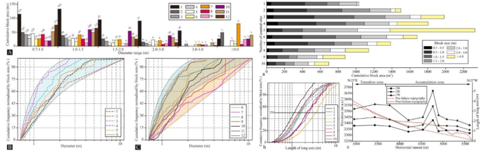 近十年来,西南交通大学程谦恭科研团队在国家自然科学基金重点项目(41530639)、国际(地区)合作与交流项目(41761144080)、面上项目(41172260 ;41372292 ;41877226;41877237)以及国家重点研发计划重点专项项目(2017YFC1501000)的资助下,先后9次穿越青藏高原,开展了详细的青藏高原腹地典型高速远程滑坡实例的详细工程地质调查,对青藏高原高速远程滑坡的发育形成特征、沉积学堆积特征及运动学机理,进行了深入的研究。近期,基于野外详细地质调查、无人机遥感成像、激光三维扫描等多种研究手段,分别详细诠释了青藏高原SN向裂谷带正断层驱动的尼续村巨型高速远程滑坡(图1a)和帕米尔高原公格尔山拉张系断裂驱动的塔合曼巨型高速远程滑坡(图1b)的沉积学特征和运动学机制,揭示了不同工程地质环境下不同运动路径物质组成情况下的高速远程滑坡的动力学机理。研究表明:(1)尼续村滑坡和塔合曼滑坡均沿着区域性活动断裂分布,为正断层活动下触发的高速远程滑坡事件。(2)受运动路径上不同堆积物控制,两大滑坡堆积体在剖面上和表面上呈现出不同的堆积地貌特征:尼续村滑坡堆积体表面自后向前依次可见大型堆积平台、横向脊、X型共轭脊、雁裂状堆积脊、堆积丘等的分布,剖面上揭露出一系列典型的拼贴构造、内部Z型剪切带、剪切块石定向排列等堆积结构;塔合曼滑坡堆积体表面自后向前则主体为大型堆积平台、纵向侧缘脊、环状横向脊和叠瓦状堆积巨石的分布,在剖面上则主体可见粗颗粒的定向排列及下伏层颗粒剪裂现象的广泛分布。(3)在两大滑坡堆积体的剖面上,均可见反粒序堆积结构的分布,指示着滑体内部自上而下逐渐增强的差异性剪切运动特征,自上而下可划分为:硬壳层(carapace facies)、主体层(body facies)和基底层(basal facies);在硬壳层中,随着运动路径的增加,两大滑坡均表现出明显的差异性碎屑化现象,碎屑化程度主体呈现出先增强后减弱的分布规律(图2)。(4)尼续村滑坡堆积体表面和剖面所揭露出的一系列沉积学特征指示着该滑坡体运动过程中应以低扰动性快速剪切运动为主(图3);不同于尼续村滑坡,塔合曼滑坡堆积体表面和剖面上所揭露出的一系列沉积学特征则指示着滑体在低扰动的快速推移式运动过程中受阻快速停积的强剪切运动过程(图4)。基于上述地质证据的厘定和分析,研究团队提出:青藏高原高速远程滑坡在强震作用下自源区快速失稳后,整体表现出一种快速的推移式碎屑化运动过程,但受下伏运动路径上堆积体物质组成的不同,滑体在后续的运动过程中会表现出明显不同的差异性运动,有的以快速扩离式稳定流运动状态为主(即尼续村滑坡),有的则呈现出快速停积的稳定流运动模式(即塔合曼滑坡)。