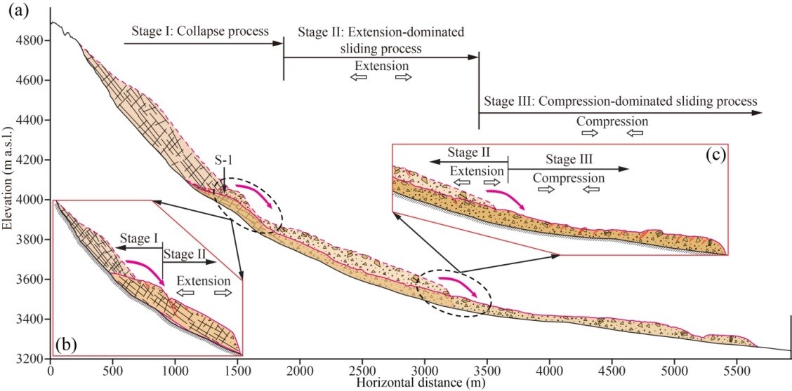 近20年来,在青藏高原造山带地质演化与环境灾害变化日益成为全球地球科学科研的前沿和热点的背景下,青藏高原藏南谷地晚新生代SN向裂谷和帕米尔高原系列走滑-拉张断裂带的形成机制等成为关注焦点,研究区巨型高速远程滑坡作为最新断裂和地震活动的指示器,不仅在揭示青藏高原内部不同类型(正断层、逆断层、平移断层)大型活动断裂运动规律上有一定指示意义,而且对于强震作用下巨型高速远程滑坡的几何学、运动学和动力学机制的研究也提供了丰富的地质证据,是青藏高原地质灾害研究的重大科学问题。