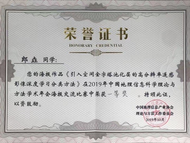 朱军、张红、陈敏、叶健等老师、研究生以及部分优秀本科生代表参加了此次学术会议。其中,朱军教授主持了虚拟地理环境专题报告,并作了题为“灾害VR场景动态构建与交互探索分析”的口头报告;陈敏副教授作了题为“视角变化鲁棒的宽基线立体像对直线特征匹配方法”的口头报告;齐华教授指导的硕士研究生郎垚和叶凌梦进行了海报展示。郎垚同学所作的展示“引入空间金字塔池化层的高分辨率遥感影像深度学习分类方法”获得海报竞赛一等奖。