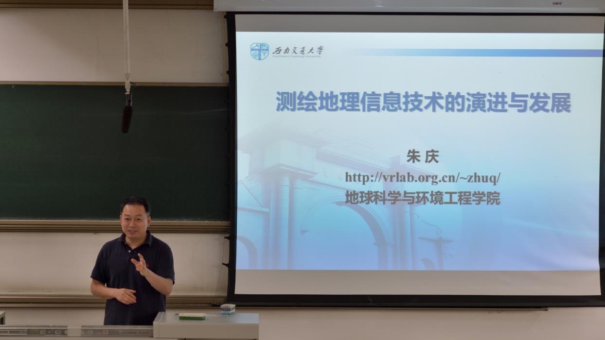 朱庆分别讲述了城镇化与信息技术的发展、测绘地理信息的使命和信息化社会的基本任务。朱庆特别提出现代数字化城市与智慧城市和正在进行的川藏铁路的建设之间的紧密联系,他说中国测绘的优越性正在逐渐显现。此外,朱庆还举出一些杰出交大人的事例来激励同学们。