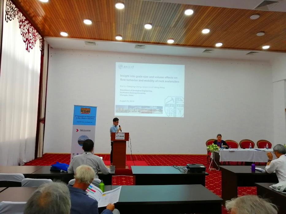 我院程谦恭教授研究团队博士研究生林棋文、李坤参加了本次会议,在“地震与滑坡灾害”分会场中,针对高速远程滑坡动力学机理这一国际热点问题,分别进行了相应的主题报告。林棋文博士进行了题为“Effects of rock mass discontinuities on the deposit