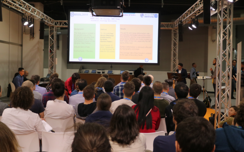 欧洲地球科学联盟(EGU)是地学界具有重要影响的学会之一,欧洲地球科学联盟年会主题涵盖地球物理、地球化学、自然灾害、地震学、地貌学、水文、冰冻圈以及行星科学等领域,在地学界具有重要影响,是全欧洲最大、最有影响的科学大会。2019年4月在维也纳举行的EGU2019共有来自113个国家的16273名学者参加, 带来了5531个口头报告,9432个海报,以及1287个交互式板报(PICO: Presenting Interactive COntent)。在EGU2019参会期间,孙春卫博士生进行了题为“Monitoring post-failure deformation of a consequent bedding rockslide by