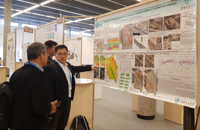 in Nanxi county, Southern Sichuan, China”的海报展示,围绕InSAR、活动断裂、滑坡预测预报等方面,与国际同行就热点问题开展了交流与讨论,此外,在会上还了解到国际地学领域的研究热点和最新动向,为进一步的学习和科研拓宽思路。