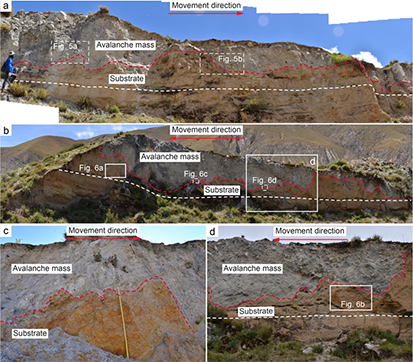 ;41877226;41877237)以及国家重点研发计划重点专项项目(2017YFC1501000)的资助下,先后沿川藏、滇藏、青藏、中巴、中尼等交通走廊,9次穿越青藏高原,在海拔4300-6200m的高原上,累计行程近10万公里,对青藏高原的高速远程滑坡发育形成特征及其动力学机理,进行了深入的研究。近期,通过野外详细地质调查、无人机遥感成像、激光三维扫描等多种研究手段,分别诠释和揭示了发育于青藏高原SN向亚东-谷露裂谷安岗地堑的正断层驱动的尼续村巨型高速远程滑坡以及川西高原毛垭坝盆地走滑逆冲断裂驱动的乱石包巨型高速远程滑坡的就位机制。研究表明:(1)尼续村滑坡和乱石包滑坡均沿着区域性活动断裂分布,为强震触发的高速远程滑坡事件。(2)两大滑坡堆积体均呈现出一定的规律性排列的堆积地貌特征:乱石包滑坡堆积体表面自后向前,依次可见大型堆积平台、横向脊、纵横交叉脊、X型共轭槽控制下的菱形堆积脊、堆积丘等的分布;尼续村滑坡堆积体表面自后向前,则依次可见大型堆积平台、横向脊、X型共轭脊、雁裂状堆积脊、堆积丘等的分布。(3)尼续村滑坡堆积体的剖面上,出现非常典型的拼贴构造、内部Z型剪切带、剪切块石定向排列等堆积结构,指示着滑坡体运动过程中应以低扰动性快速剪切运动为主;(4)滑坡堆积体的剖面上,可见反粒序堆积结构的分布,指示着滑体内部在垂向上具有差异性剪切特征,越靠近滑体底部,颗粒运动过程中所承受的剪切应力越高,颗粒的碎屑化程度越高;表层颗粒的碎屑化程度较低,主要表现为初始结构面控制下的碎屑化过程,颗粒组成以巨石为主,常呈架空状构造;(5)尼续村滑坡堆积剖面上,发育有大量滑坡堆积体底部层与下卧层之间强相互作用的地质证据——底辟构造、平卧褶皱、小型剪切断裂等。基于上述地质证据的厘定和分析,研究团队提出:青藏高原高速远程滑坡多受控于强震活动,滑体自源区高速失稳后,表现为一种以内部差异性剪切作用为主的稳定流运动状态,运动过程自后向前大致可以划分为流通区的快速拉张运动、堆积区中后部的快速挤压运动和堆积区前缘的快速扩离运动。