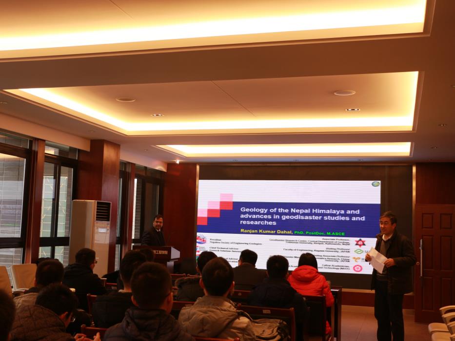 the Nepal Himalaya and advances in geodisaster studies and researches”的学术讲座,此次学术讲座的主要内容包括:(1)喜马拉雅山区的区域地质概况、活动构造与历史强震记录;(2)地震诱发滑坡的分布规律;(3)中尼经济走廊及其邻区的地质灾害发育特征;(4)岩崩及其防护措施。报告内容非常丰富,数据翔实,引人入胜;参会的各位老师和学生与Ranjan Kumar Dahal教授,就不同地震诱发滑坡的分布规律、中尼经济走廊的大型灾难性滑坡特征及滑坡坝等相关问题进行了深入的交流和热烈的讨论。