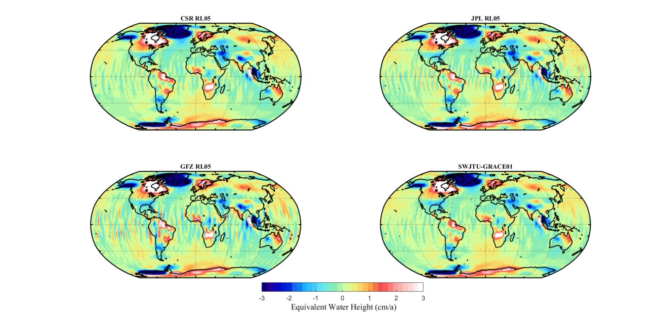 计算中心所提供的计算设备,反演了第一代GRACE时变地球重力场模型(SWJTU-GRACE-RL01),与国际三大官方机构(CSR、JPL、GFZ)反演的时变地球重力场模型精度相当。该模型已被国际地球重力场模型中心(ICGEM)接收,并可在该网站免费下载(//icgem.gfz-potsdam.de/series/02_GRACE_monthly_other/SWJTU-GRACE-RL01)。据悉,该网站已发布了国内同济大学、华中科技大学、中科院测地所和武汉大学等相关科研团队的时变地球重力场模型产品。高精度时变地球重力场模型可用于监测全球质量变化,包括冰盖或冰川消融、陆地水储量变化、海平面变化、地震重力变化等研究。