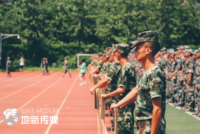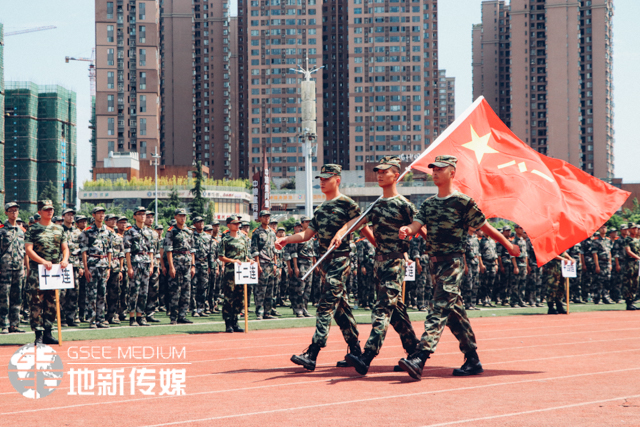 大会第一项,全体起立迎军旗,鲜红的军旗和迈着坚定步伐的士兵们在全体新生的注目下由排尾行至排头。