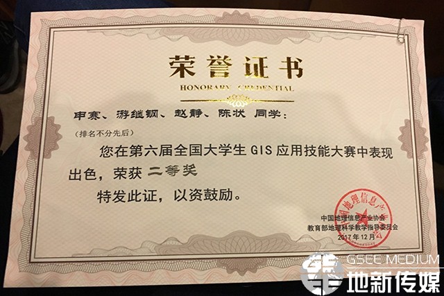 由测绘遥感信息系杨骏老师指导,四位同学申赛,游继钢,陈状,赵静组成的队伍荣获国家二等奖。
