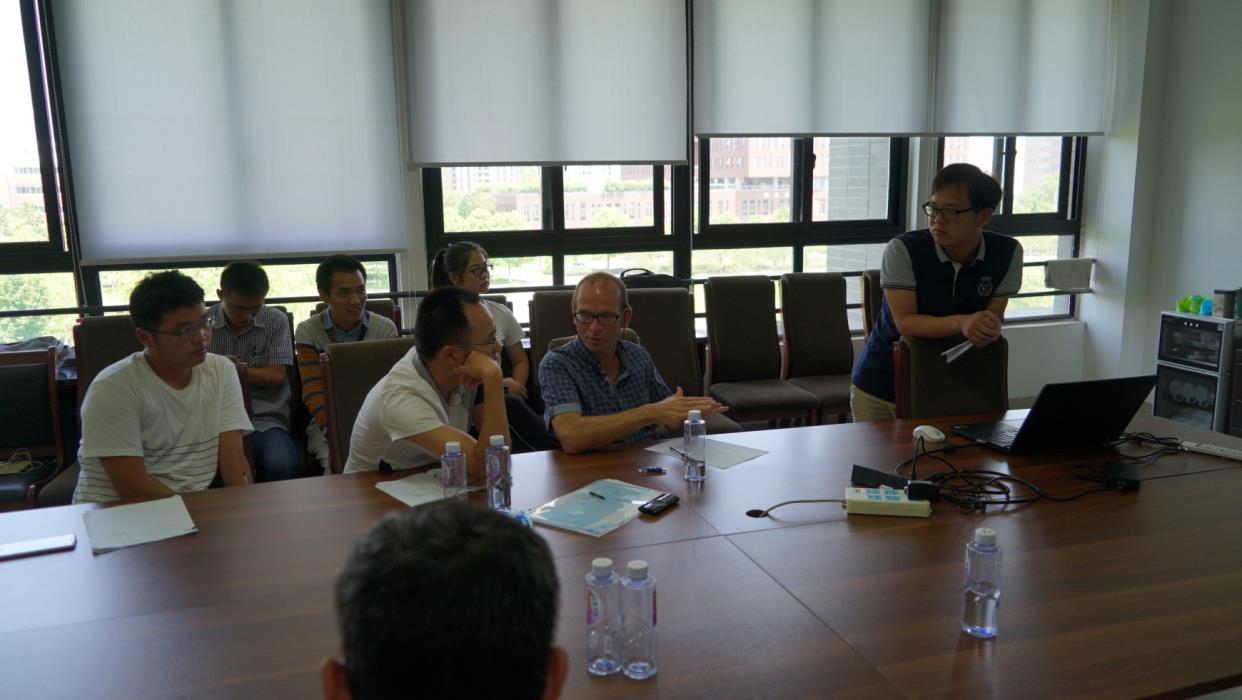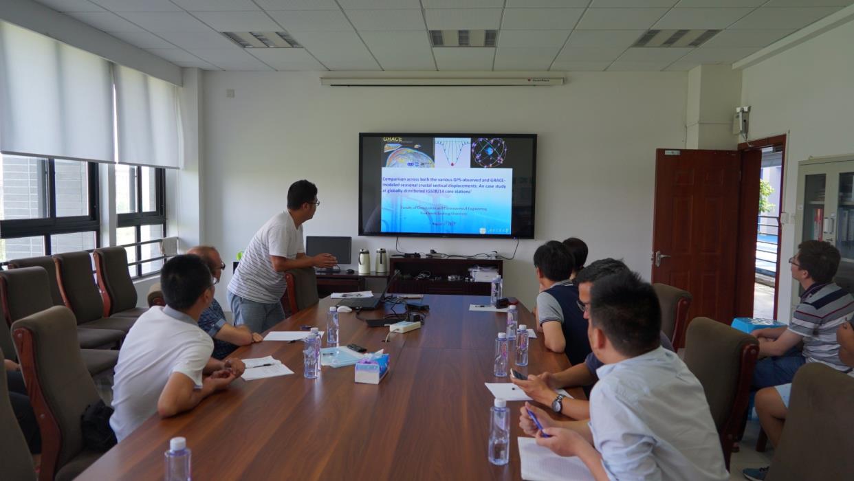 最后,范东明教授科研团队博士生谷延超做了《Applying spatial and/or temporal constraints to GRACE spherical harmonic coefficients to determine robust mass variations》和《Comparison across both the various GPS-observed and GRACE-modeled seasonal crustal vertical displacements: An case study at globally distributed IGS08/14 core stations》的报告,博士生余彪做了《The impact of different parameterization strategies on the results of gravity inversion》的报告,Kusche教授提出并讨论了相关问题。