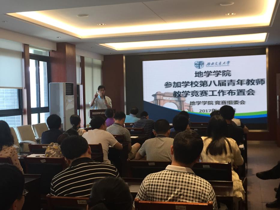 初赛活动。我院符合参赛条件的青年教师53名,除因公不能参加9人和符合免初赛直接进入复赛3人外,实际参加初赛教师36名,初赛参赛率达88%。本次初赛按参赛课程将参赛青年教师划分为地质组、测绘遥感信息1组、测绘遥感信息2组、环境和消防组等四个组,分别由巫锡勇、袁林果、陈强和赵锐等教授主持;地质组评委由副院长胡卸文教授、巫锡勇等教授、文江泉和赵晓彦副教授担任,测绘遥感信息1组评委由副院长刘成龙教授、范东明、熊永良和张献州等教授担任,测绘遥感信息2组评委由陈强教授、汤家法、龚涛和冯德俊等副教授担任,环境消防组由副院长欧阳峰教授、付永胜、李启彬和贺玉龙等教授、林鹏副教授、宋广瑞讲师担任;评委秘书组由系秘、各系工会小组长和实验室教师担任;40名学生代表参加了听课。