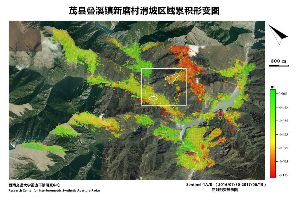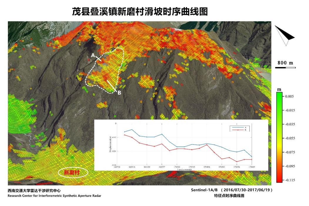 与此同时,我院刘国祥教授领导的InSAR研究团队立即启动茂县相关滑坡位移时序计算与分析,持续下载2016年7月至2017年6月间多幅存档卫星SAR影像数据,基于合成孔径雷达干涉(InSAR)时序分析技术开展了大量的数据处理,得到了过去一年内茂县相关滑坡体表面每隔12天的位移累积量及其时间序列,相关结果已提交给参与现场救灾和灾情评估工作的有关专家。在分析叠溪镇新磨村滑坡区域及其周边范围内近一年的历史形变数据的同时,在石大关乡区域(距新磨村滑坡约18.5公里的)也探测出了较大位移量的不稳定滑坡体。下图陈述了新磨村和石大关滑坡的位置及其在2016年7月至2017年6月间的坡体表面位移累积形变及时序形变结果。