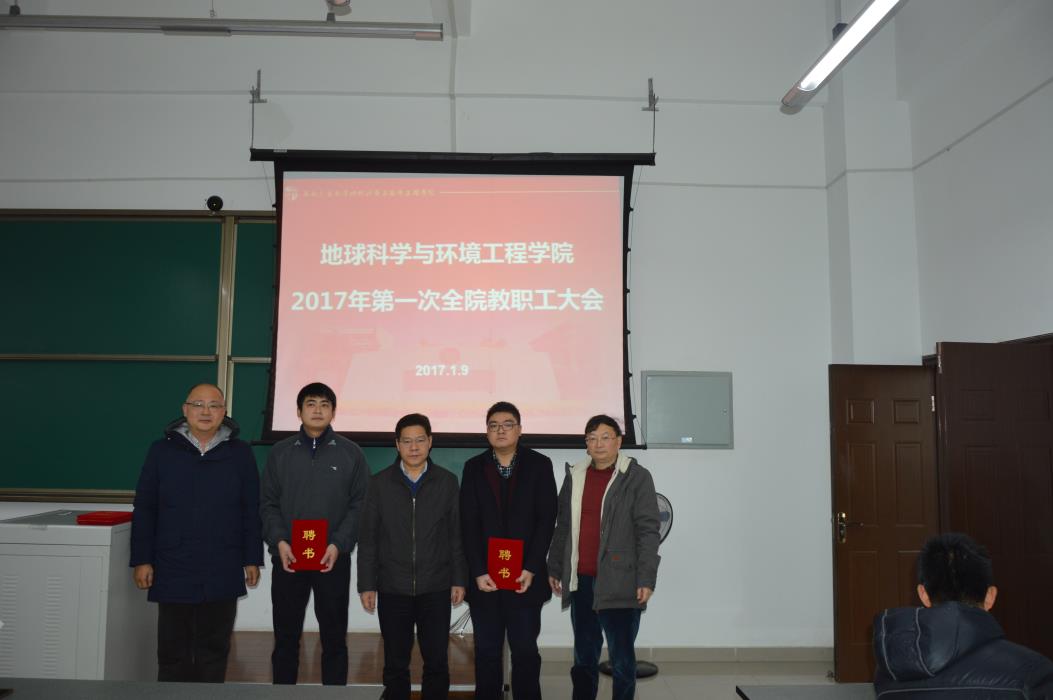 聘任决定。刘国祥院长、欧阳峰副院长、齐华副院长为测绘系、地质系、环境系、消防系新班子成员颁发证书并合影。接着,离任系主任张建强、徐柱发言。他们讲到,各系目前取得的成果,是全系老师共同努力的结果,希望大家继续努力,创造更多的成果。新任系主任,袁林果教授、巫锡勇教授、赵锐教授、林鹏教授做任职发言。他们讲到,系主任这个职位意味着责任,义务与担当。工作中要做到,勤学勤勉;要带好班子成员,做好平台建设、人才建设、国际化建设等;要求真务实,增强工作的时实效性,听取并采纳好的意见与建议;要当当正正做人,老老实实做事。最后他们做了表态:不忘初心,甘于奉献;尽力而为,问心无愧。