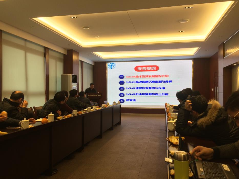 基本情况、人才情况、创新平台建设情况、学科专业发展情况、创新团队建设情况、教学与科学研究情况等等。此外,刘院长还就铁四院工勘院感兴趣的遥感科研情况作了介绍,并重点介绍了InSAR 理论与技术研究进展及其在高速铁路与地质灾害监测中的应用情况。