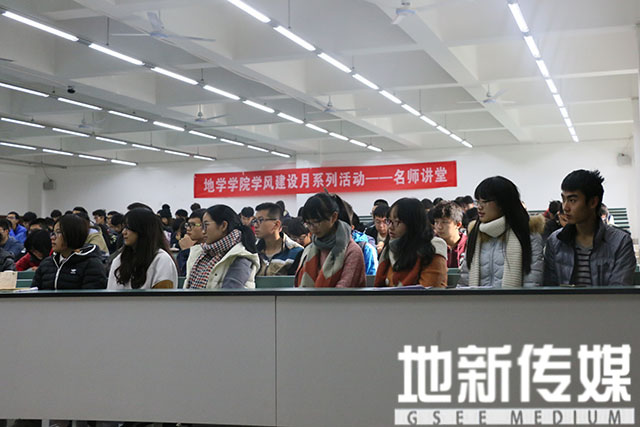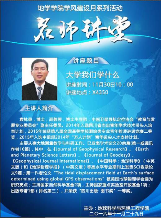 傅书记在主持中讲到,袁林果教授是国家级青年人才,西南交通大学唐立新优秀学者,教授,博士生导师,中国卫星导航定位协会“教育与发展专业委员会”副主任委员。袁林果教授主要从事大地测量教学与科研工作,2014年入选四川省杰出青年学术技术带头人培育计划,2015年荣获第八届全国高等学校测绘类专业青年教师讲课竞赛二等奖,2015年入选中组部2014年“万人计划”青年拔尖人才支持计划。今天袁老师要讲大家大学学什么,希望大家听了以后,加以反思,有所收获。