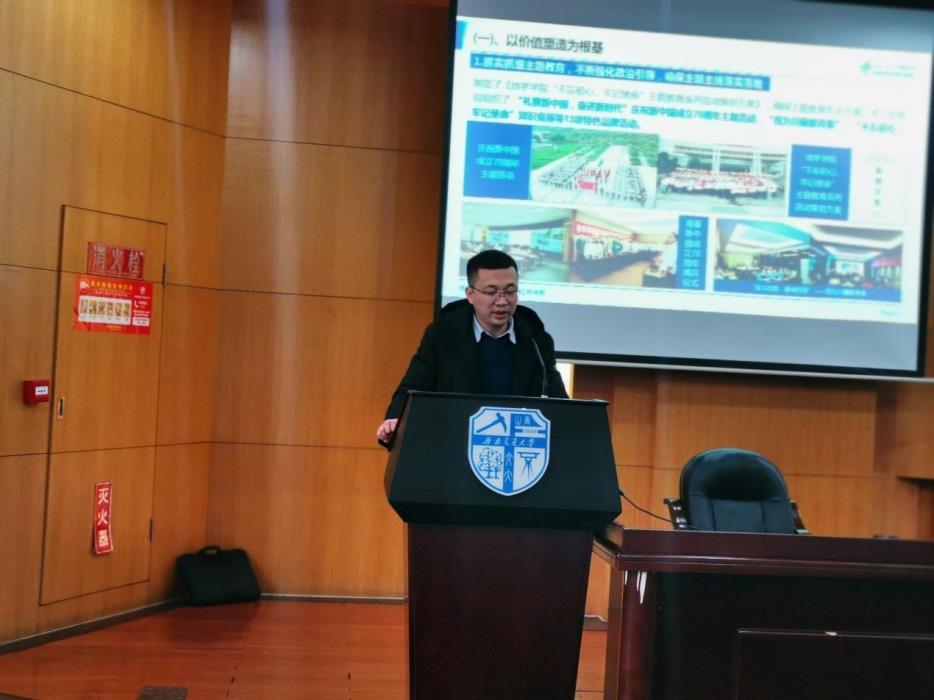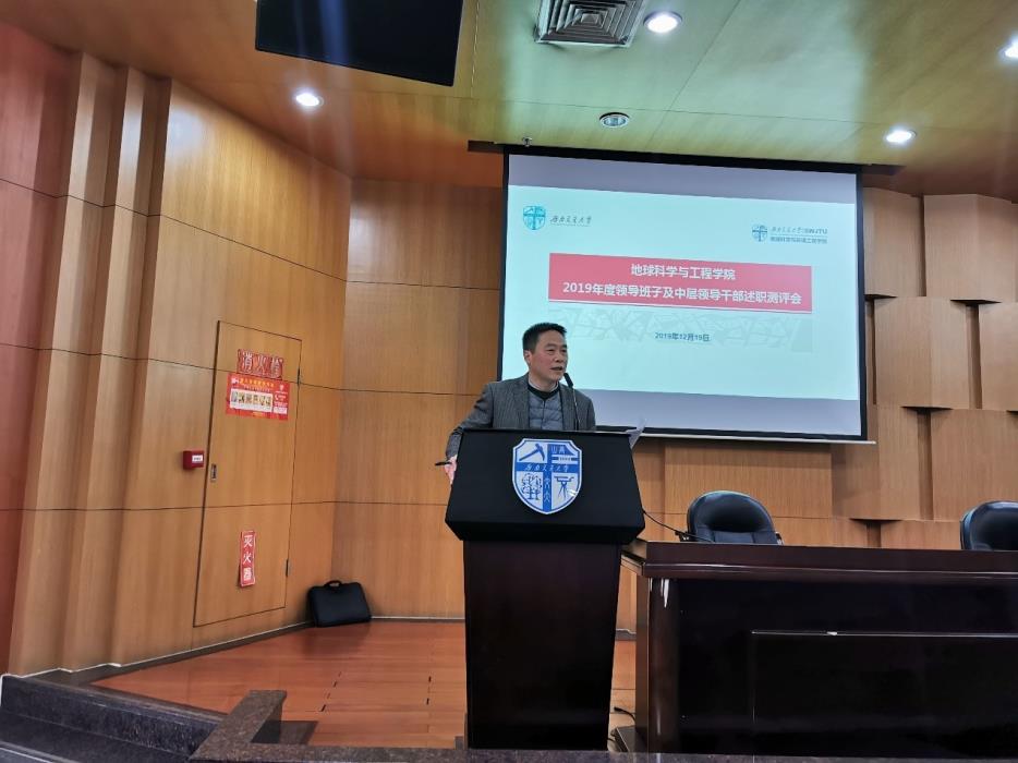 副院长欧阳峰进行2019年度个人述职。主要围绕双一流本科建设工作、测绘工程专业认证工作、2019级培养方案修订、四川省教改项目、青年教师教学竞赛、2020级推荐免试研究生工作、升机教学名师、测绘工程卓越班纳入学员管理等方面做工作汇报。