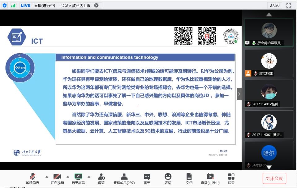 4.ICT:罗彦虎学长以华为为例,建议有心的学长多去参加相关举办的大赛,并指出ICT就业前景广阔,值得大家尝试。