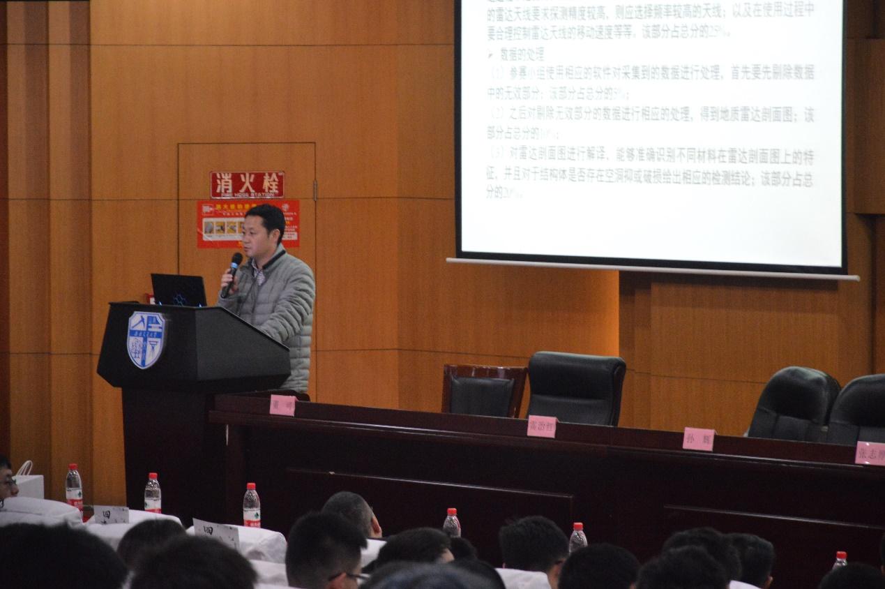 廖必成、张志厚分别讲解了竞赛的A、B内容,并就各个项目阐明了竞赛要求与相关注意事项。廖必成向同学们介绍了成都四海岩土工程有限公司的情况,并讲解了竞赛A内容中的测试规则,具体阐述了竞赛中评委的评分标准与注意事项,并强调了参与竞赛的专业知识且团队间配合的重要性。张志厚提出竞赛内容B主要考察对某结构物的质量的无损检测。