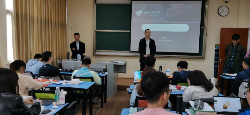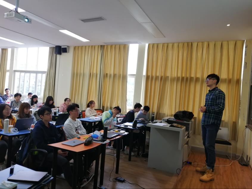 党委副书记傅尤刚,辅导员杨都强,2017级优秀学生代表何玮、贾舒婷主讲。