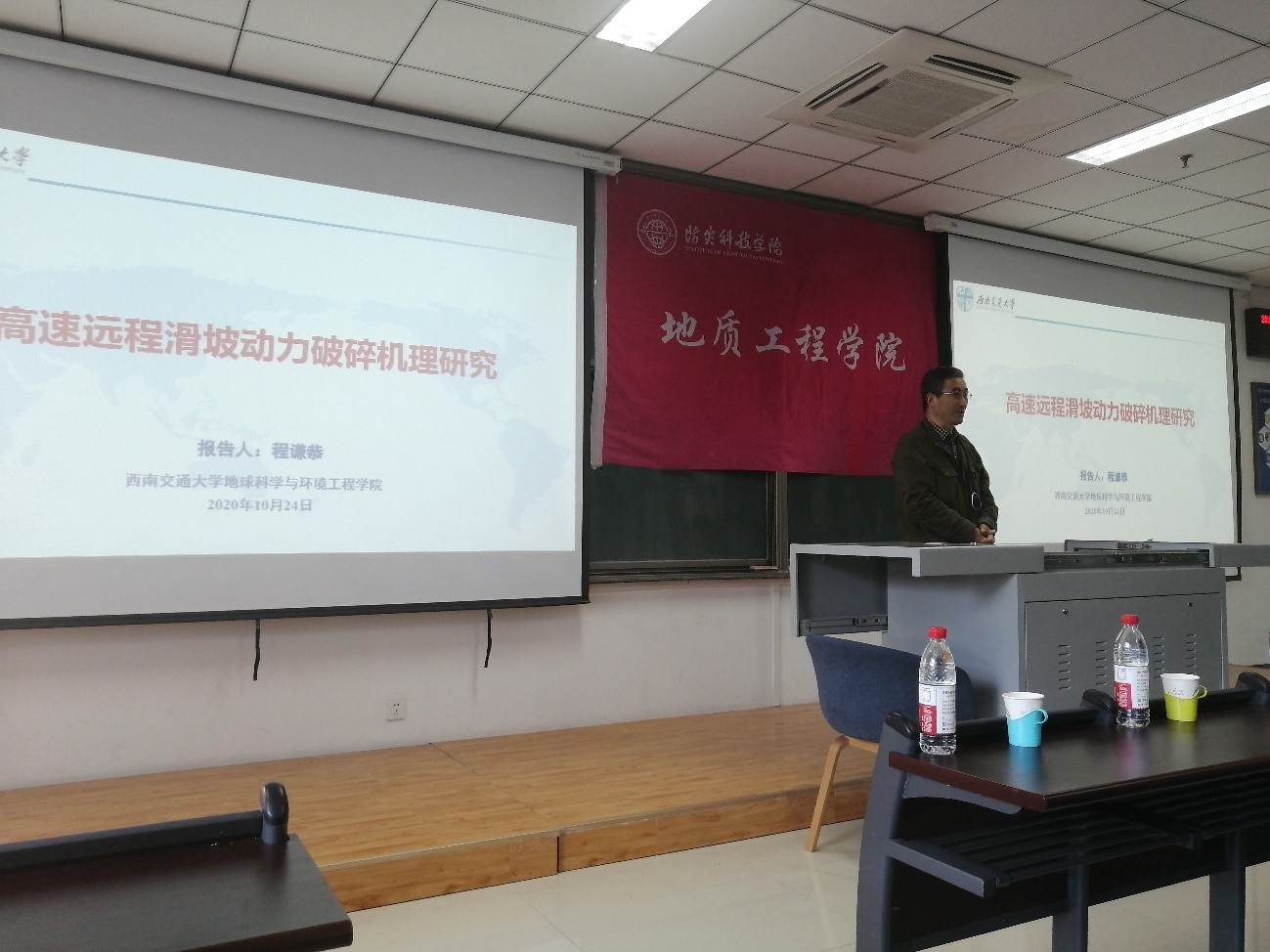 本科生、研究生及青年教师进行了题为“高速远程滑坡动力破碎机理研究”的学术讲座。在近2小时的讲座中,程谦恭教授用生动形象的语言,深入浅出地介绍了高速远程滑坡的基本特征及研究现状、青藏高原高速远程滑坡灾害典型案例、滑坡动力破碎的研究意义与研究进展。程教授富有激情的讲座感染了在场近百名师生,引起了热烈的提问和讨论。