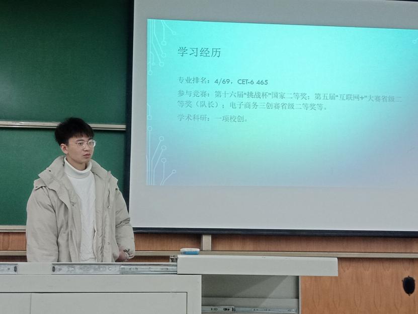熊标首先从专业排名、竞赛参与、学术科研三个方面介绍了个人优异的学习经历,之后向同学们讲述了个人保研情况并介绍了保研时的专业选择。他以自身为例,讲述了选择保研专业的重要性与方法,同学们对此次宝贵的经验分享认真聆听、学习。