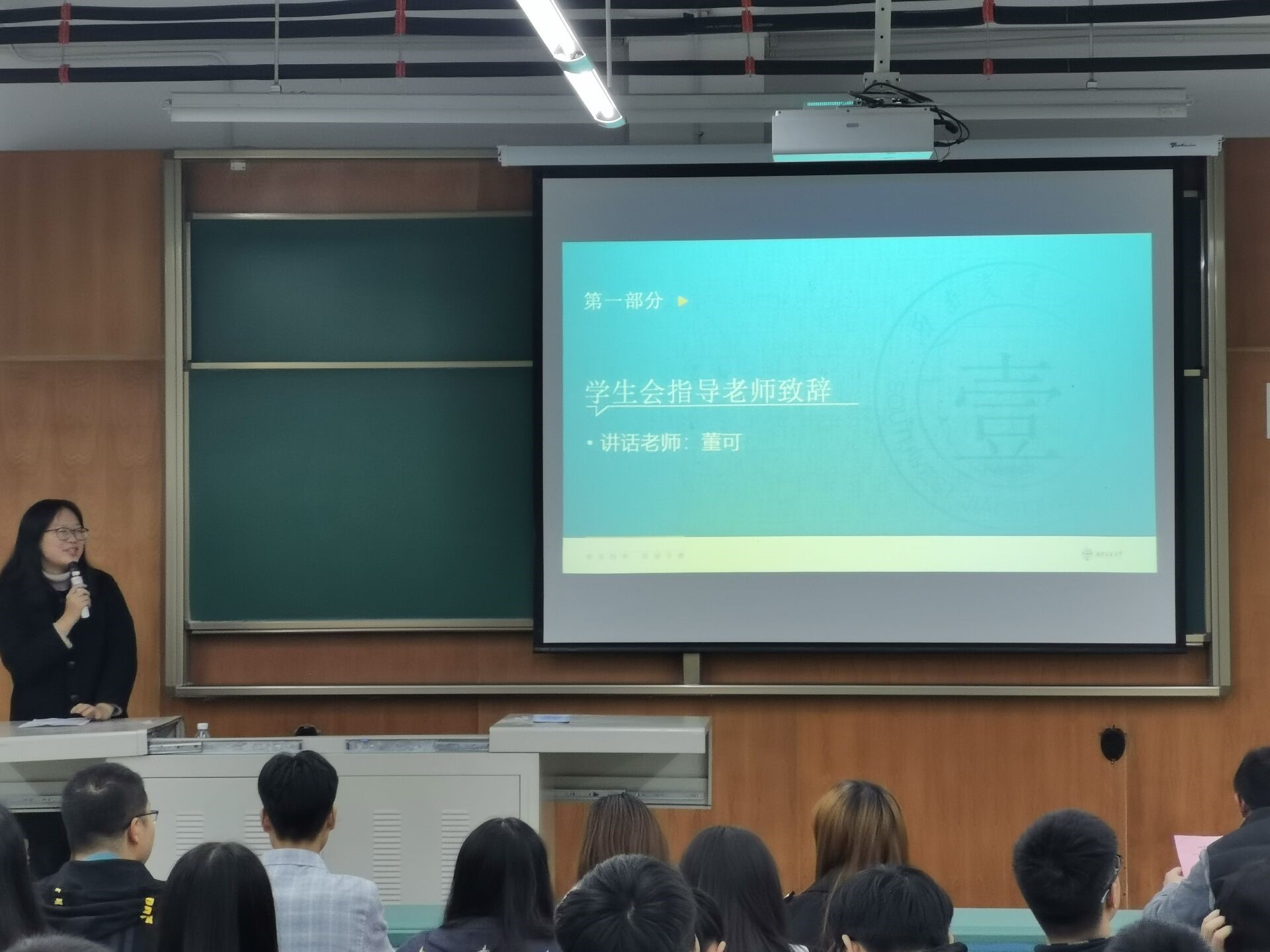 晚上九点半会议准时开展,学生会指导老师董可老师上台致词