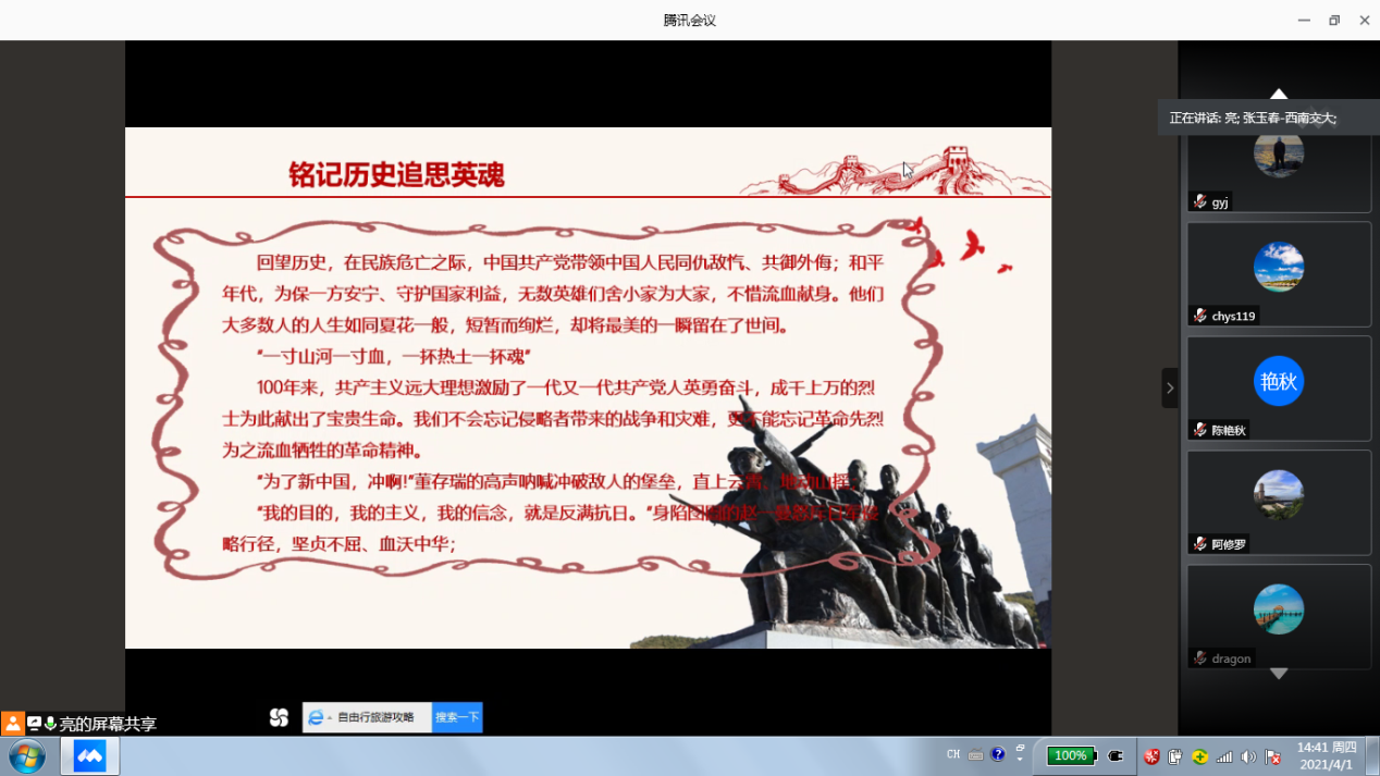 又到一年清明时。为缅怀革命先烈,倾听英雄事迹,传承红色基因,4月1日下午2:30,教工消防党支部开展了以“致敬⋅2021清明祭英烈”为主题的党日活动。本次活动通过线上和线下相结合的方式,支部全体党员都参加了这次活动。