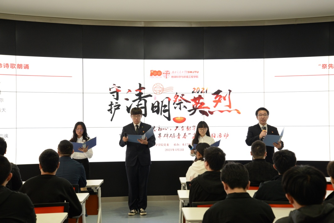 接着,崔新蕾、刘佳宁、秦璇睿、徐润鹏四位同学的领读下,全体人员共同朗诵诗歌《清明》。本次活动在高亢激昂的诵读声中圆满结束!